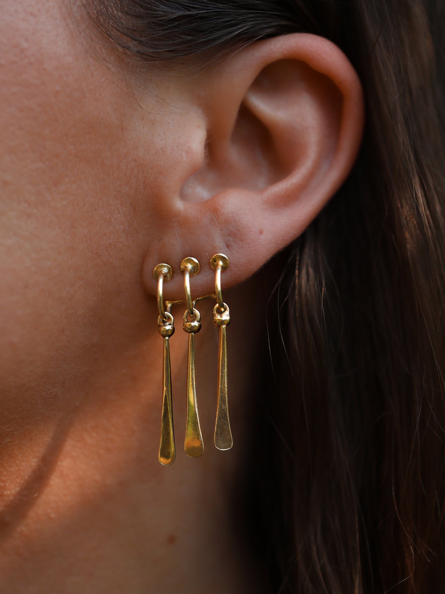 Interamente realizzato a mano nella versione argento e argento placcato oro. Il suo design ricrea l'effetto tre orecchini indossati insieme, ma con un solo buco.