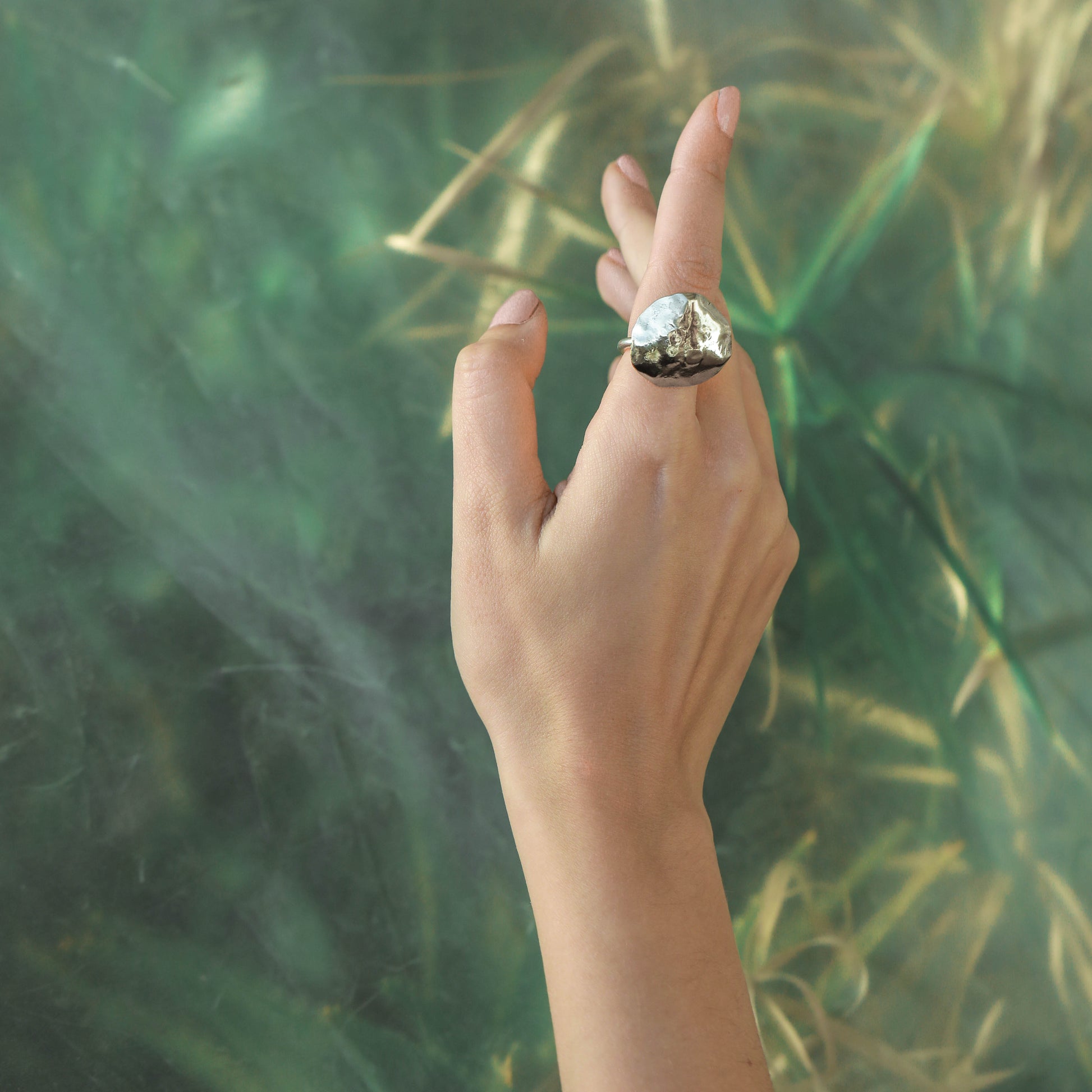 L'anello è interamente realizzato a mano e regolabile nella dimensione. Il 'Fungo' una volta indossato l'anello si alza leggermente e può ruotare su se stesso