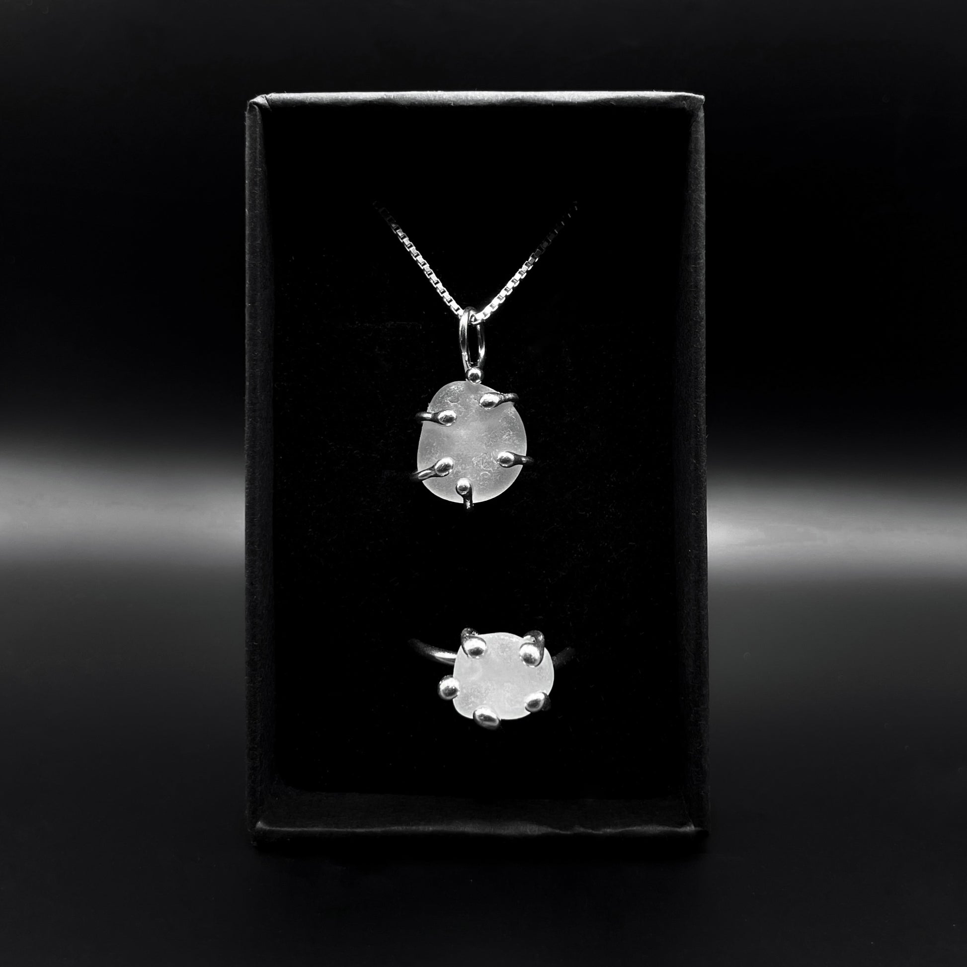 La box Marea Inverno comprende un anello (regolabile) e una collana con ciondolo in argento 925 e vetro levigato dal mare.