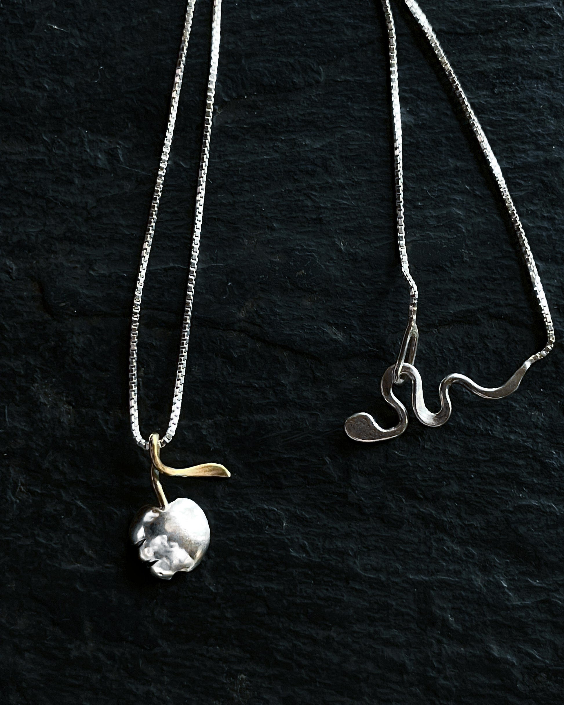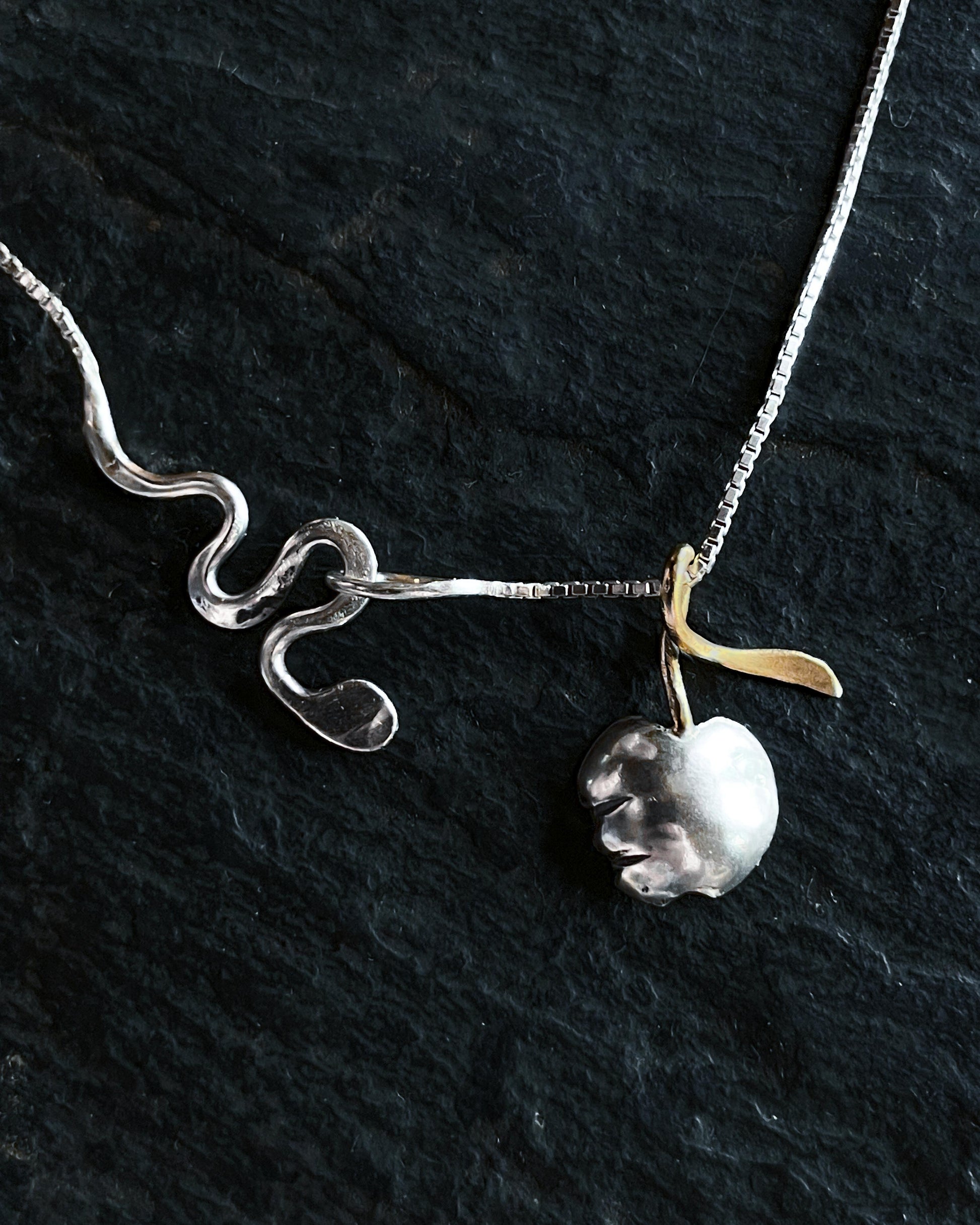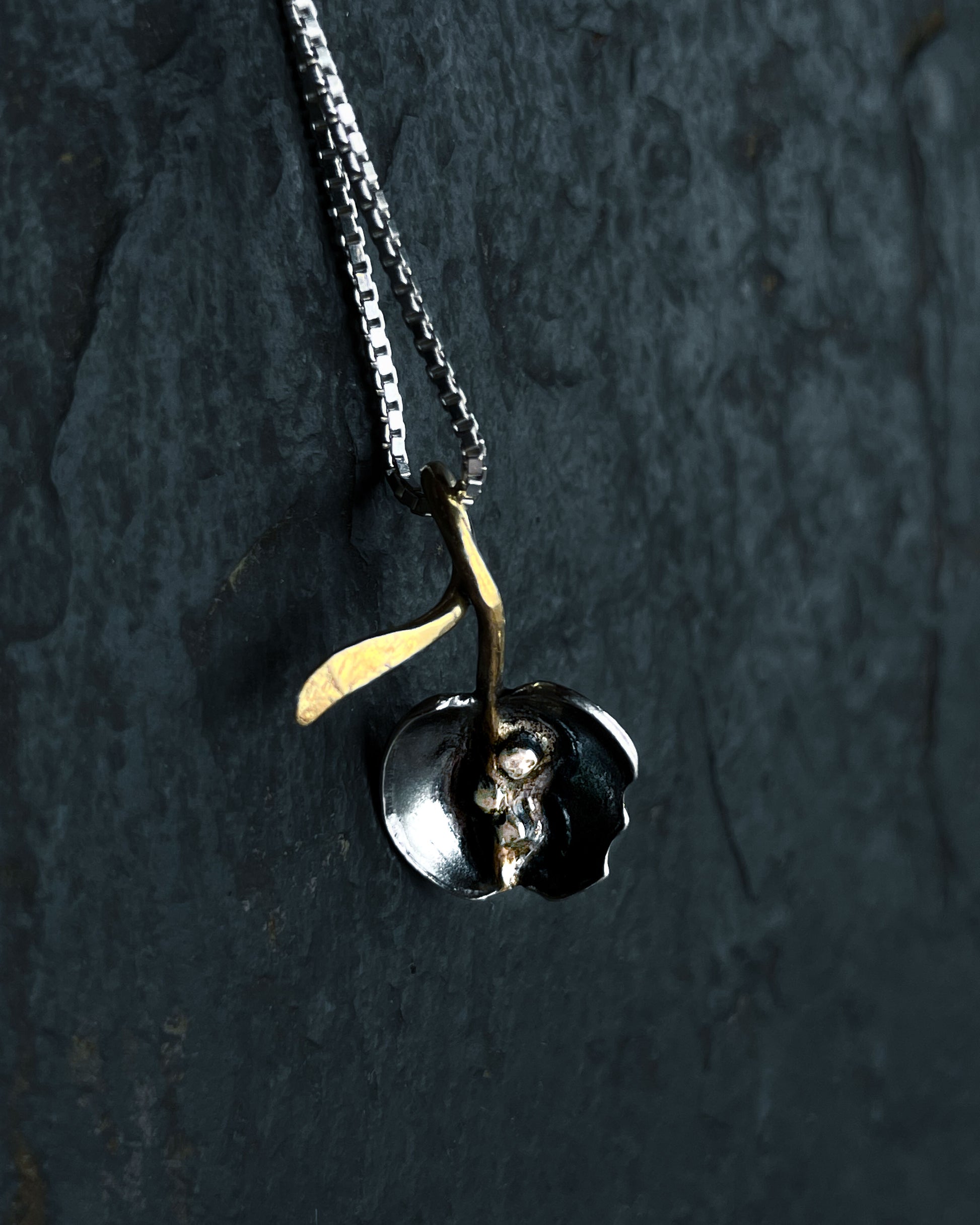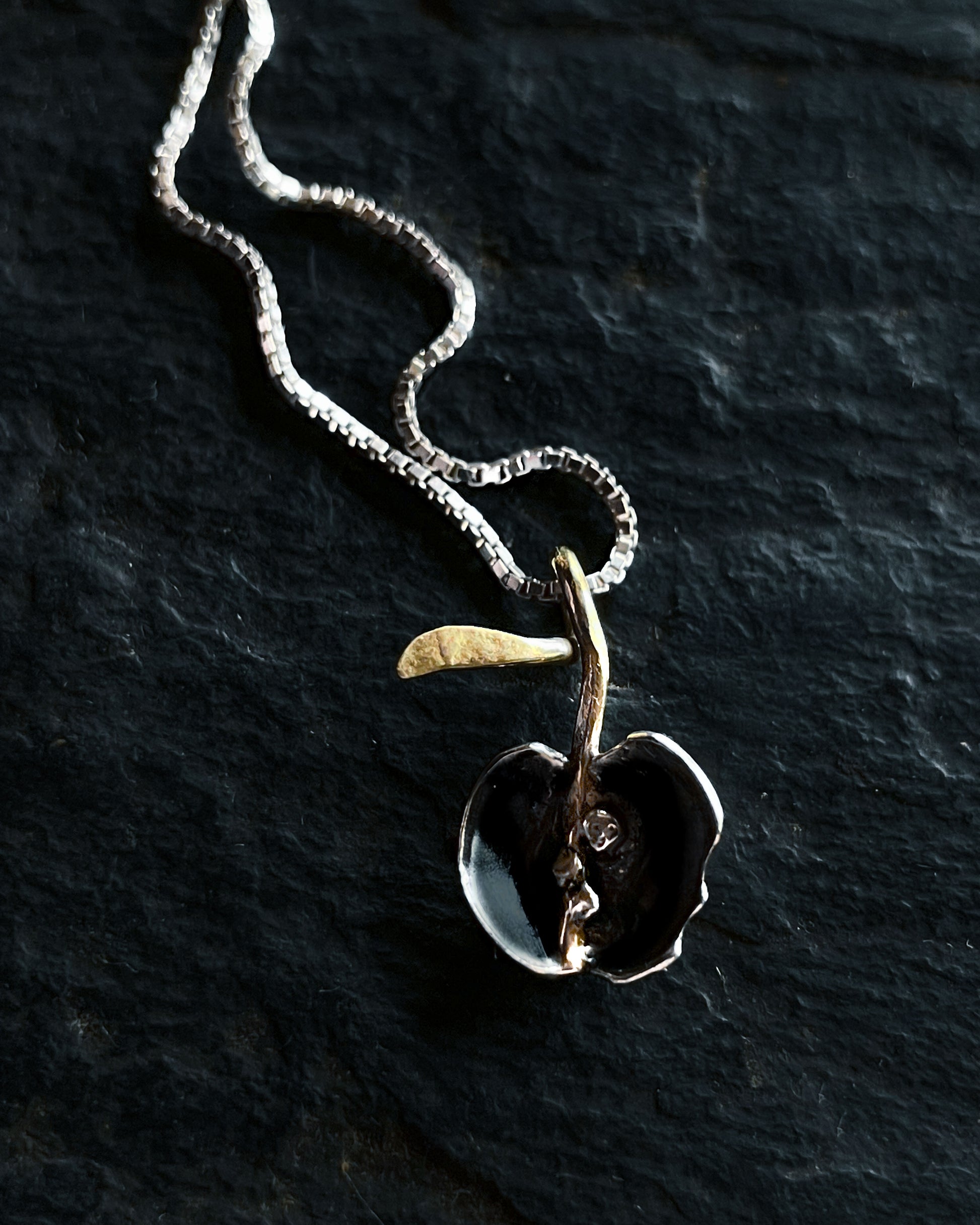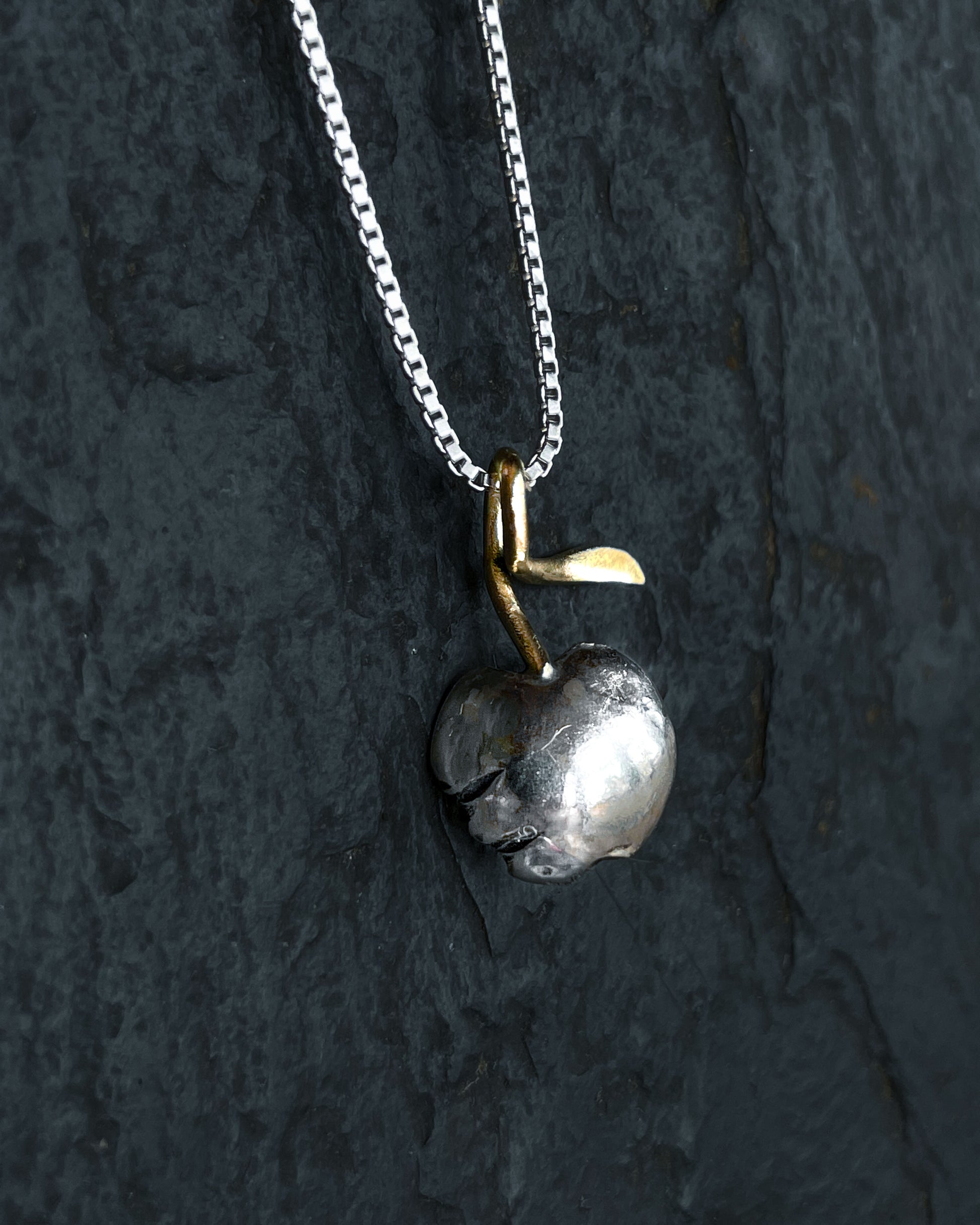 Ciondolo raffigurante una mela morsa in argento (con gambo in ottone) realizzato interamente a mano.